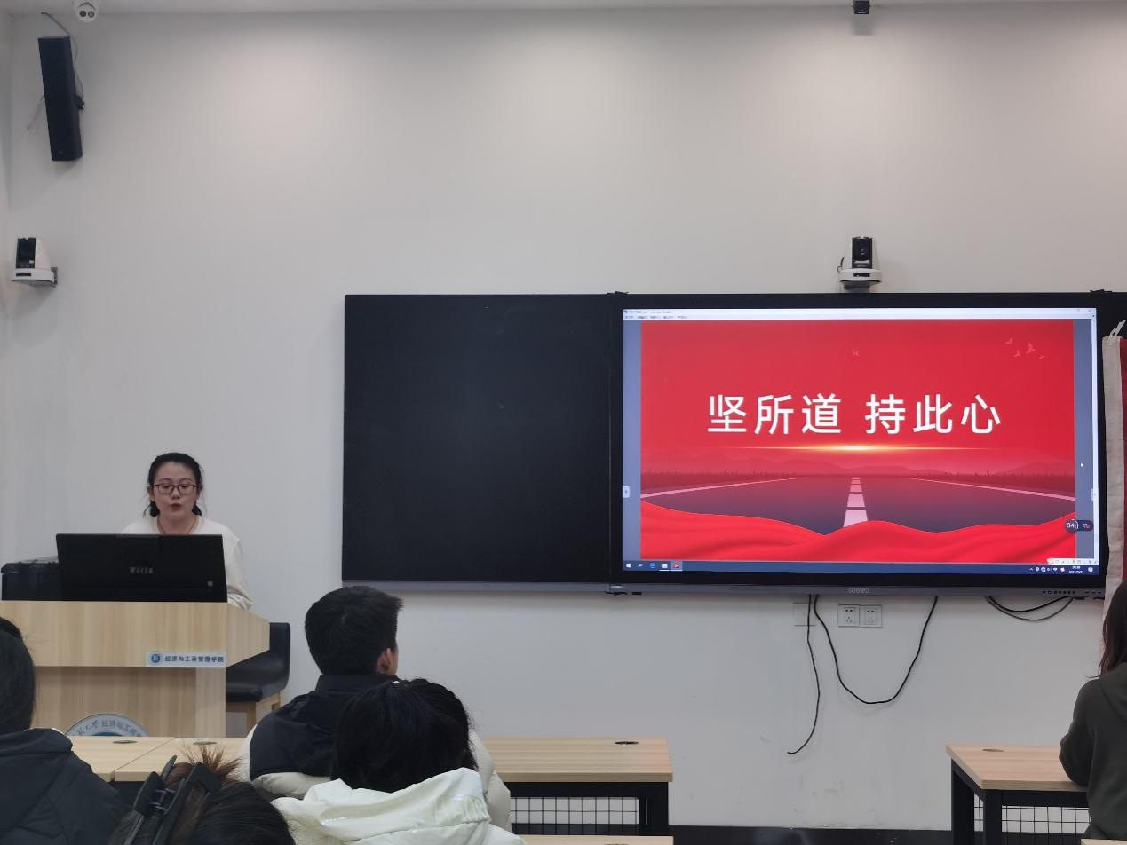 刘香含围绕“五个坚持”理念,向同学们介绍了中华民族的发展历程与新时代青年的使命担当,重点讲解了“坚持以人民为中心的发展思想”和“坚持发扬斗争精神”。她聚焦脱贫致富和高铁建设,以情景设置、故事讲述等方式,带领支部成员感受十余年来国家的重大变化和高速发展,激励支部成员艰苦奋斗、共担使命,并生动讲述革命先烈恽代英坚持斗争精神的一生,引导青年学生吃苦奋斗,积极投身现代化国家建设。