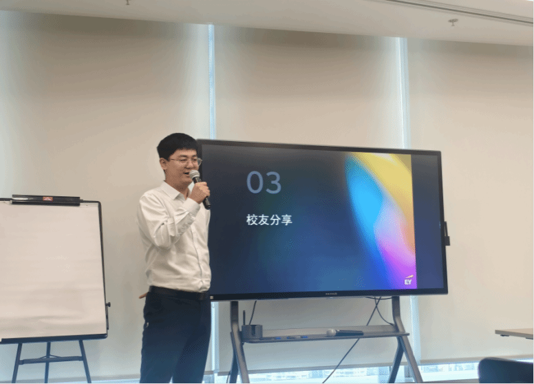 在随后的座谈会上,安永武汉分所审计主管谭亮总围绕事务所业务架构、职业发展路径及行业趋势展开分享。行业趋势分享结束后,安永武汉分所人力主管李佳总详细介绍了事务所的校招项目与实习生计划。她提到,安永每年面向高校开放审计、税务、咨询等多个方向的校招岗位,并推出“精英实习生计划”,为在校生提供参与真实项目、接触行业前沿的机会。最后,邀请到了2023年入职安永武汉分所的我院2020届金融专硕校友张俊毅进行心得分享,他提到选择安永,不仅因其国际化的平台和清晰的晋升路径,更因这里包容创新的文化让新人能持续突破自我。他结合自身经历,建议学弟学妹们在校期间夯实财务专业知识,同时多维度展开实习,并积极参与团队项目以培养沟通协作能力。