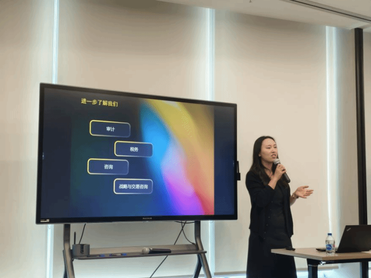 下午两点钟,师生一行抵达位于武汉恒隆广场写字楼33层的办公区。安永华明会计师事务所(武汉分所)人事主管、我校外国语学院97级校友李佳带领师生参观现代化办公环境,并详细介绍了智能审计工具的应用案例,展示了数字化转型如何赋能审计流程优化,令同学们直观感受到科技与专业服务的深度融合。