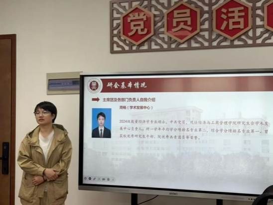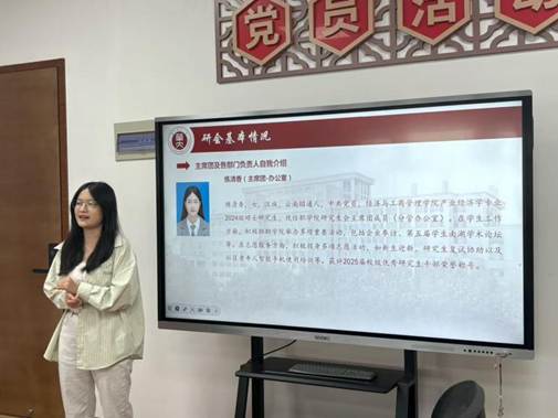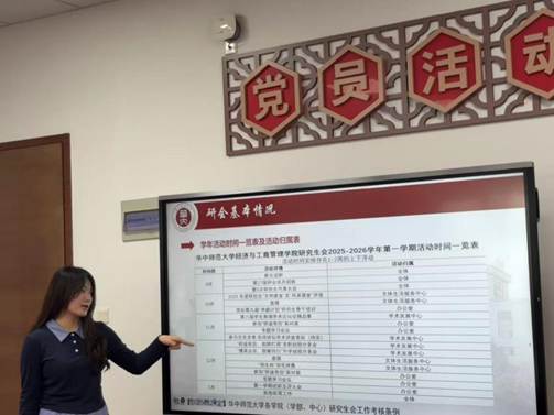 随后,曾蕾详细介绍了研会的基本架构与运行模式。她通过学年活动时间一览及活动归属表,清晰梳理了工作重点与活动规划,并结合学院学科特色与研究生培养目标,对学院基本情况进行了补充说明,让全体成员对研会工作的定位与方向有了更具体的理解。
