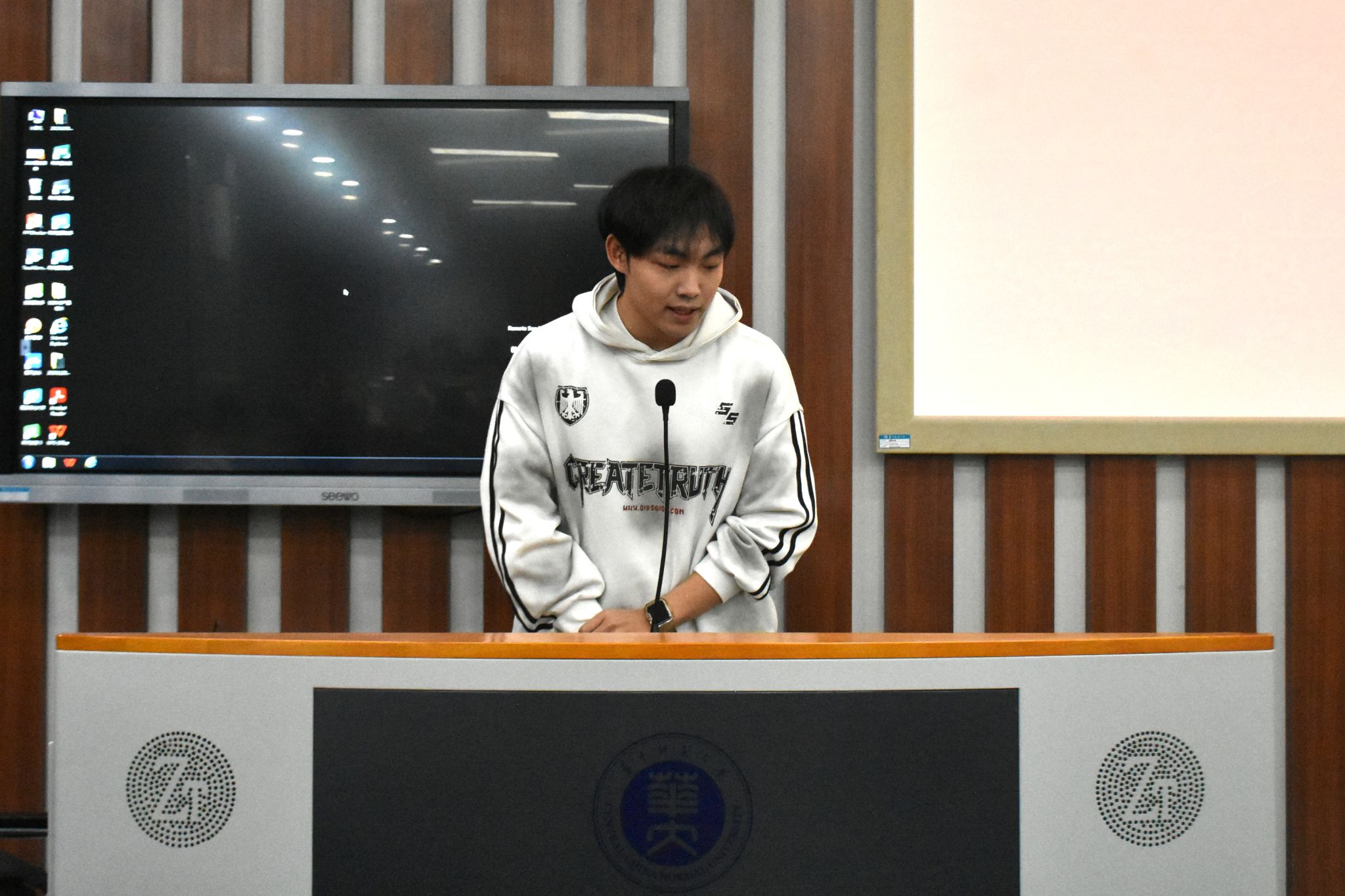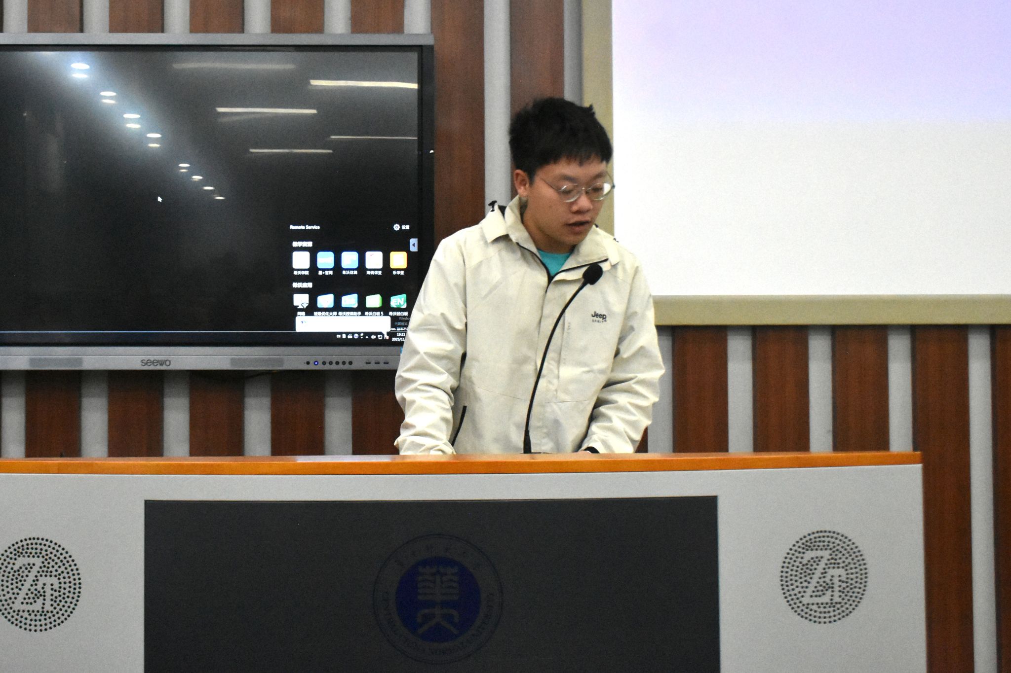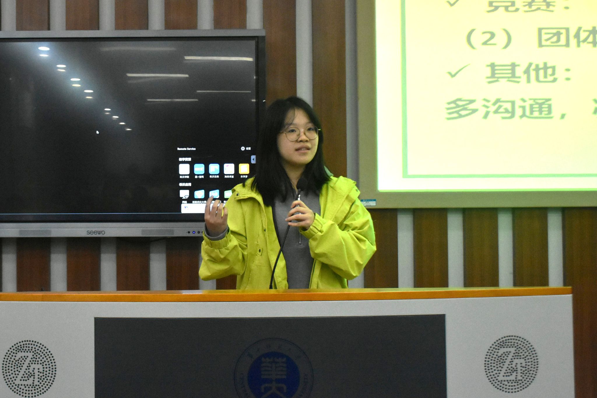 学院学生会青年文体中心主要负责人戴成凯学长围绕学生工作经验进行分享,提出“勇敢去做,全当试错”的工作理念。他系统梳理了校级、院级、年级三级学生组织架构,阐释了学生工作在提升综合能力、丰富履历、铺垫职业方向等方面的价值,鼓励新生以“有一份热,发一份光”的心态积极参与,在实践中积累经验,实现成长。