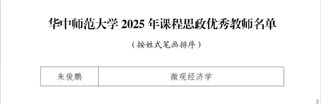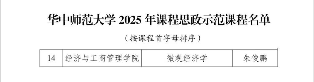 为全面落实推进学校课程思政建设,不断提高学校人才培养质量,学校开展了2025年课程思政示范课程结项评审和优秀教师评选工作。经本人申请、学院推荐、学校评审并公示,决定授予《比较教育学》等二十三门课程为课程思政示范课程和王玉凤等二十三位教师为课程思政优秀教师称号。其中,我院朱俊鹏教师所教授的微观经济学课程获选。