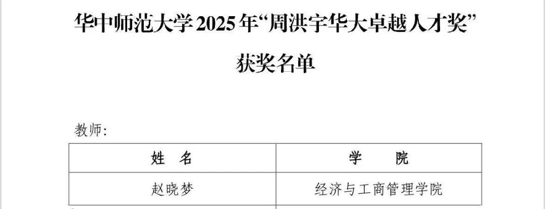 根据《华中师范大学周洪宇华大卓越人才基金章程》及《关于评选周洪宇华大卓越人才奖的通知》等文件精神,学校在全校教师和学生中开展了“周洪宇华大卓越人才奖”申报与评审工作。经各学院(中心)申报,“周洪宇华大卓越人才奖”评审委员会评定,共2名教师获奖。其中,我院赵晓梦教师获奖,并被奖励人民币10000元。