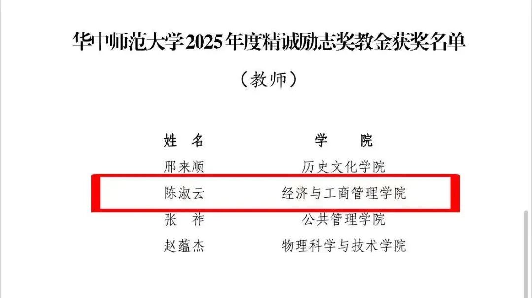 根据《华中师范大学精诚奖励基金章程》及学校相关文件精神,学校在全校教师中开展了精诚奖励基金的申报与评审工作。经各学院(中心)申报,由研究生院、本科生院推荐及评审委员会评定,共4位教授获奖。其中,我院陈淑云教授获奖,并被奖励人民币15000元。