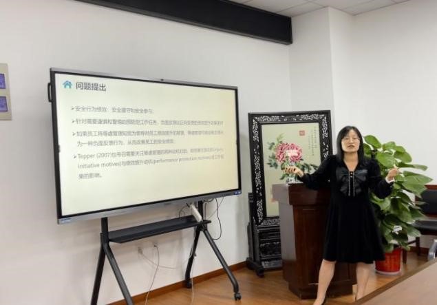 首先,袁潇老师进行了题为《骂是高期待还是高伤害:归因认知过程视角下辱虐管理对安全绩效的影响》的主题汇报。她基于辱虐管理相关的研究背景,循序渐进地提出四个问题,并在后续研究中详细回答。