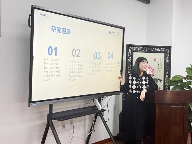 随后,詹元芳老师进行了题为《上行下效是见贤思齐?团队间互助的形成机制与边界条件》的主题汇报。该项目拟围绕团队间互助行为形成的内在机制这一问题展开研究,探讨团队领导角色外的跨团队帮助影响员工跨团队帮助行为的涓滴效应、团队领导强制性的跨团队帮助影响团队间互助与员工跨团队帮助的双刃剑效应等,基于此提炼出促进团队间互助协作的管理对策建议。