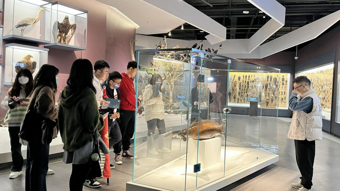 最后同学们参观的是华中师范大学生物博物馆。在讲解员的带领下,同学们逐一参观序厅、动物系统演化和多样性展示厅、植物系统演化和多样性展示厅,了解各种标本的形态特征,生活习性,从而领略生命的多姿多彩。在参观过程中,讲解员详细的解释中华鲟的标本,使同学们更加深入了解中华鲟的物种简史、栖息环境、生活习性等知识内容。同时,讲解员也普及了一些生物科学的知识,讲解了生物标本馆中各种珍藏的动物、植物标本,以及有关标本的制作、由来、历史等小知识。在讲解员的详细讲解中,同学们感受到了一代又一代华师人不懈努力的成果,更加深刻领悟到了薪火相传的华师精神。