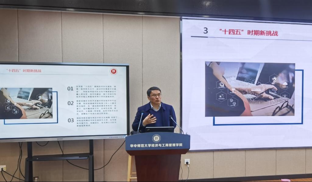 会议第二项,涂院长向大会报告《华中师范大学经济与工商管理学院“十四五”教育事业发展规划》。涂院长首先从学科发展、科学研究、师资队伍、人才培养、国际化建设、党建工作等方面,总结了我院“十三五”期间教育事业发展取得的成绩、存在的问题及不足,然后提出了“十四五”期间整体规划与发展目标。涂院长强调,“十四五”期间,学院要更加紧密的对接国家重大战略需求、紧紧围绕国家关于人才培养和经济学、工商管理学学科建设要求,更好地服务国家和地方经济社会发展、更加突出培养高层次应用型人才的中心地位,明确“冲一流、强特色”的发展思路、强化质量意识,抓住“十四五”发展机遇,推进学院人才培养、学科专业建设再上新台阶。