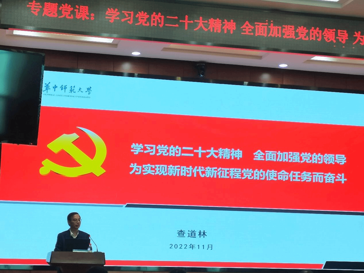 (通讯员:廖宸)11月17日上午,校党委副书记查道林同志为经济与工商管理学院第11期党员发展对象讲授《学习党的二十大精神,全面加强党的领导,为实现新时代新征程党的使命任务而奋斗》专题党课,本次党课为我院和政治与国际关系学院合办,在文华公书林4楼模拟联合国教室举行。我院分党委书记聂耀华同志出席并参与学习。