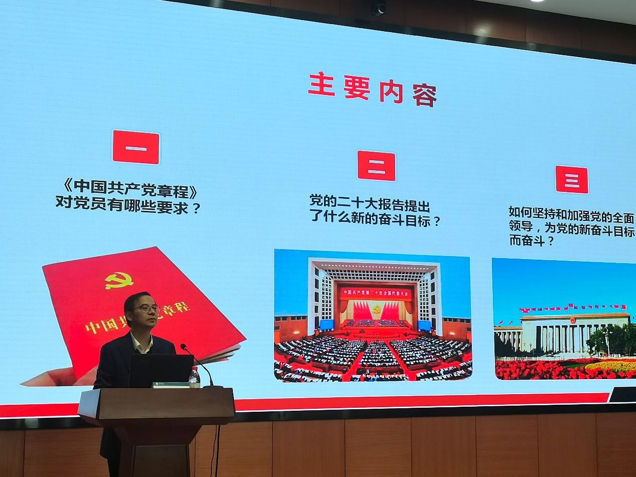 查书记的授课从“《中国共产党章程》对党员有哪些要求”、“党的二十大报告提出了什么新的奋斗目标”、“如何坚持和加强党的全面领导,为党的新奋斗目标而奋斗”三个方面展开讲解。