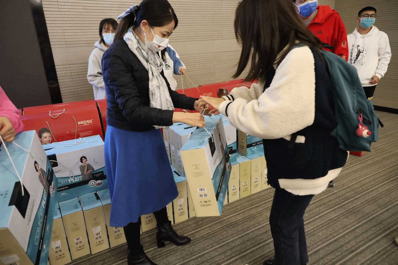 接着,老师们以及志愿者为学生们发放暖心物资。同学们井然有序地排队等候,当从老师和志愿者们手中接过防寒物资时,都感受到了来自经管大家庭的关爱。