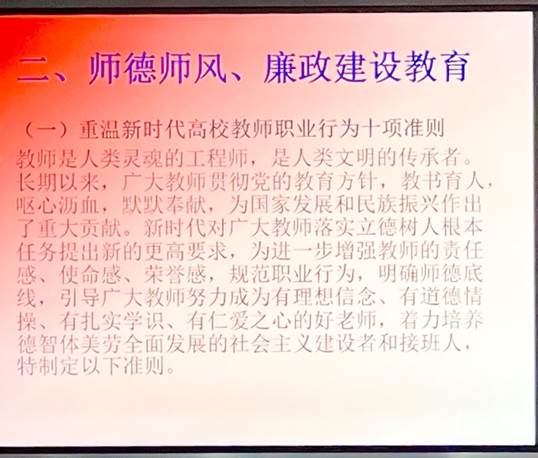 会上,聂耀华带领老师们再次学习了《新时代高校教师职业行为十项准则》和《关于高校教师师德失范行为处理的指导意见》出台的时代背景和重要意义、文件主要精神和具体内容,并结合近期媒体报道的高校教师师德失范行为案例,再次强调师德师风建设的必要性和重要性。