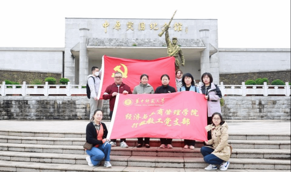 2023年4月22日,华中师范大学经济与工商管理学院行政教工党支部赴孝感市大悟县,深入开展学习贯彻习近平新时代中国特色社会主义思想主题教育实践活动,参观中原突围陈列馆、开国大将徐海东故里金岭村,接受党性洗礼和革命教育,凝聚奋进力量。本次活动由支部书记张林带队,正处职组织员闫丽莉、院办主任肖和容等7名党员及教师参加本次活动。