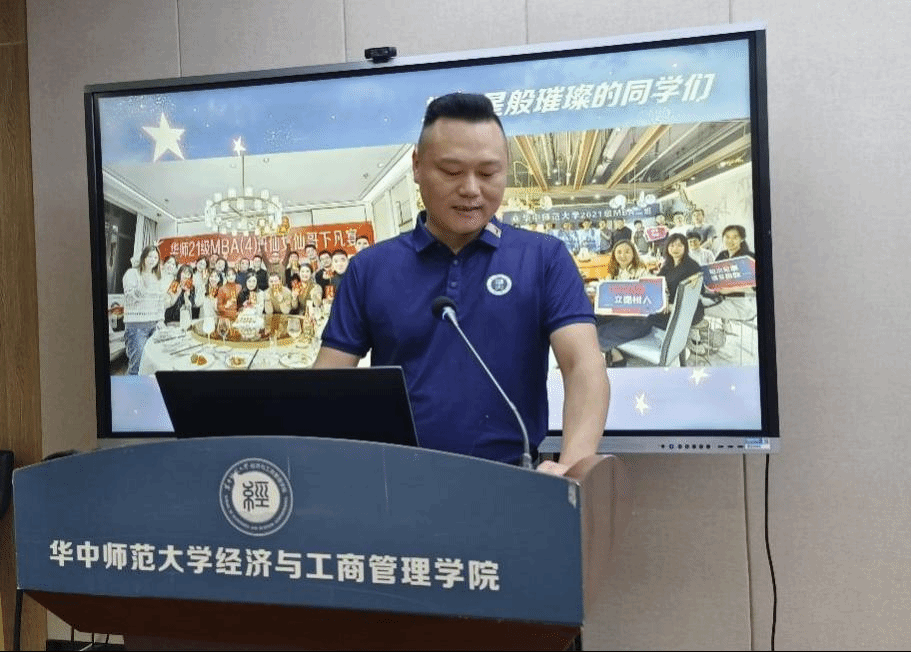 MBA联合会主席、我院2022级MBA陈克旭同学分享了在校学习的经历,展示了充满活力又有趣的MBA课堂氛围以及丰富多彩的课外活动,鼓励新同学积极参与课堂学习、利用学校平台拓展眼界,汲取新知识。