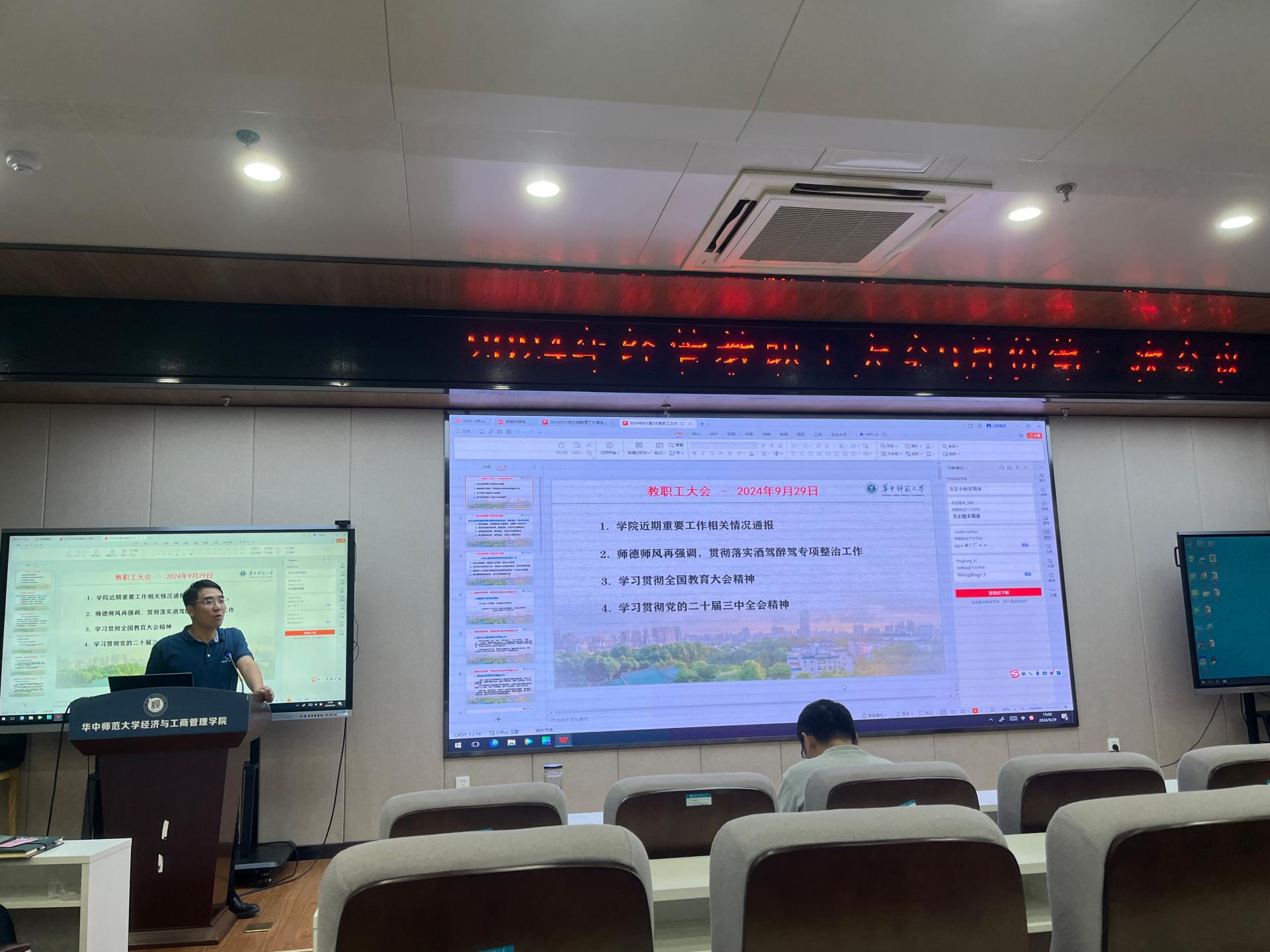 (通讯员:麻一宁 彭蕊)为学习贯彻党的二十届三中全会精神和全国教育大会精神,进一步推动学院各项工作顺利开展,9月29日下午,经济与工商管理学院在南湖综合楼10127会议室召开教职工大会。会议由学院党委书记张勇主持,全体教职工参加会议。
