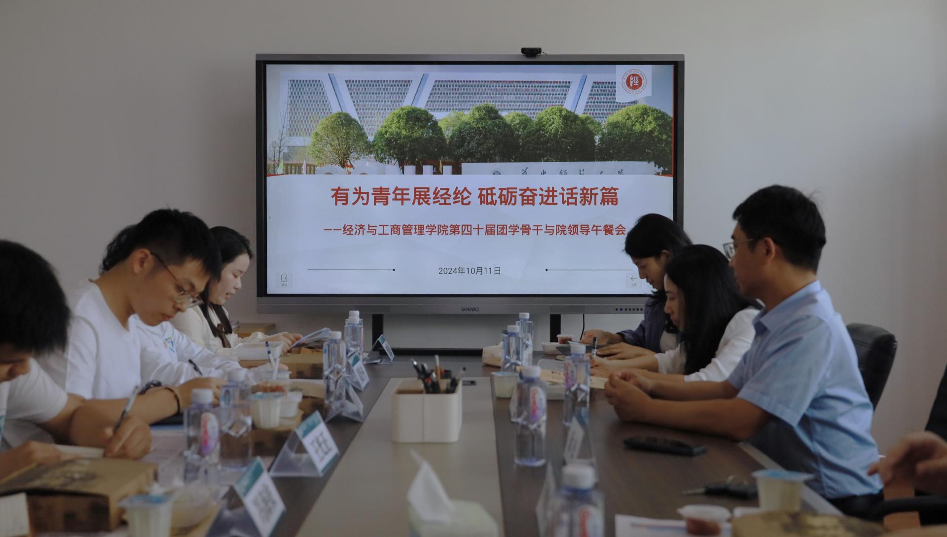 为加强学院领导与团学组织沟通交流,促进学生工作的组织与开展,经济与工商管理学院于2024年10月10日中午举行团学骨干与院领导午餐会,经济与工商管理学院党委书记张勇、正处职组织员徐杰、党委副书记陈娟、团委书记樊启迪、团委副书记胡梦旭、研究生辅导员李佳蔓及本研学生会执行主席、团委副书记(学生)参加本次午餐会。