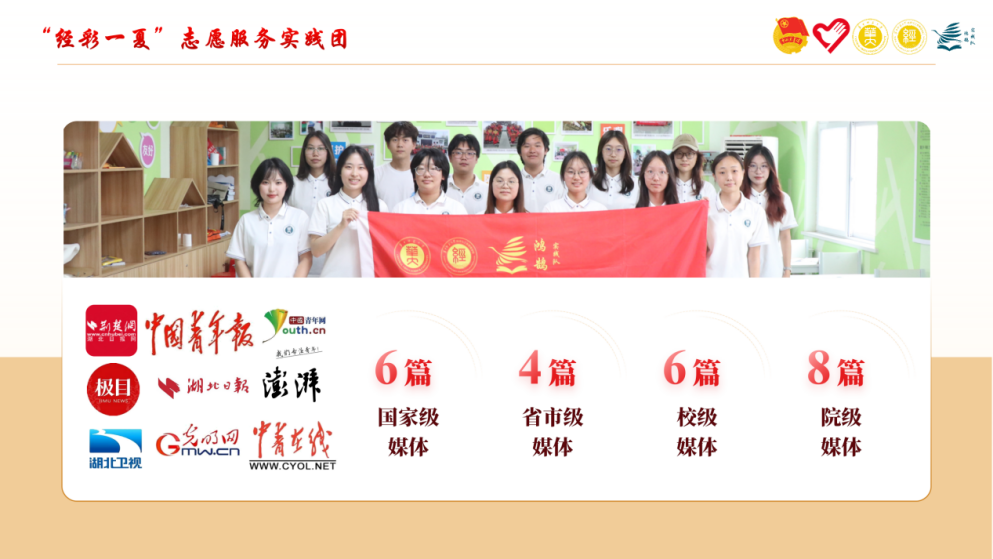 经彩一夏愿服务实践团帮助孩子们开拓眼界,丰富知识,在孩子们心中埋下梦想的种子。实践团宣传成果斐然,团队共获得国家级报道六篇、省市级报道四篇、校级报道六篇、院级报道八篇,受到社会、学校等多方关注重视,获湖北卫视专访报道。