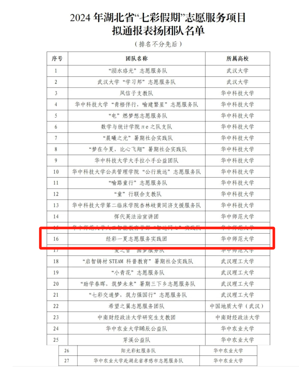 2024年11月21日,2024年湖北省“七彩假期”志愿服务项目通报表扬团队名单正式出炉,我院经彩一夏志愿服务实践团深入武汉市东山街道开办“暑假学堂”爱心托管班,为当地儿童带去丰富多彩的课程,开展一系列寓教于乐的活动,并获2024年湖北省“七彩假期”志愿服务项目通报表扬。