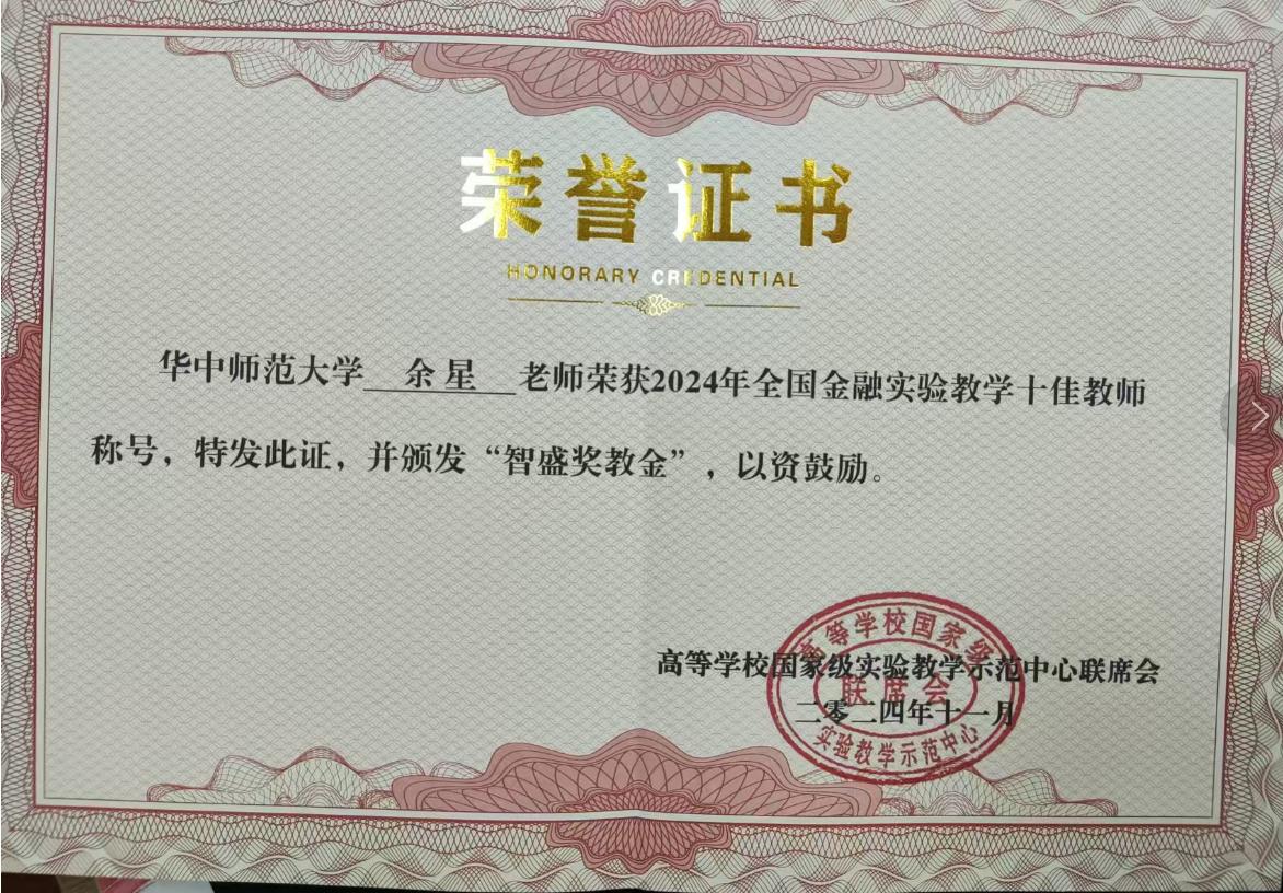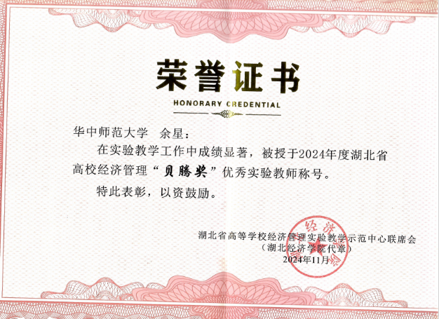 此前,余星老师还获得了2024年度“湖北省高校经济管理实验教学优秀教师”称号。