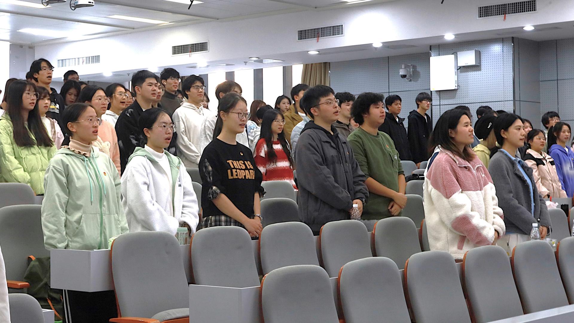 会议伊始,全体与会人员起立,奏唱团歌。随后,组织部成员何润鑫作为优秀学员代表发表了自己的感言。她回忆起学期初自己带着紧张与期待加入团学组织的心情,并就对在团学培养下的成长与感悟进行了分享,表达了自己“青春盛世正当时,应积跬步行且知”的信心与决心。