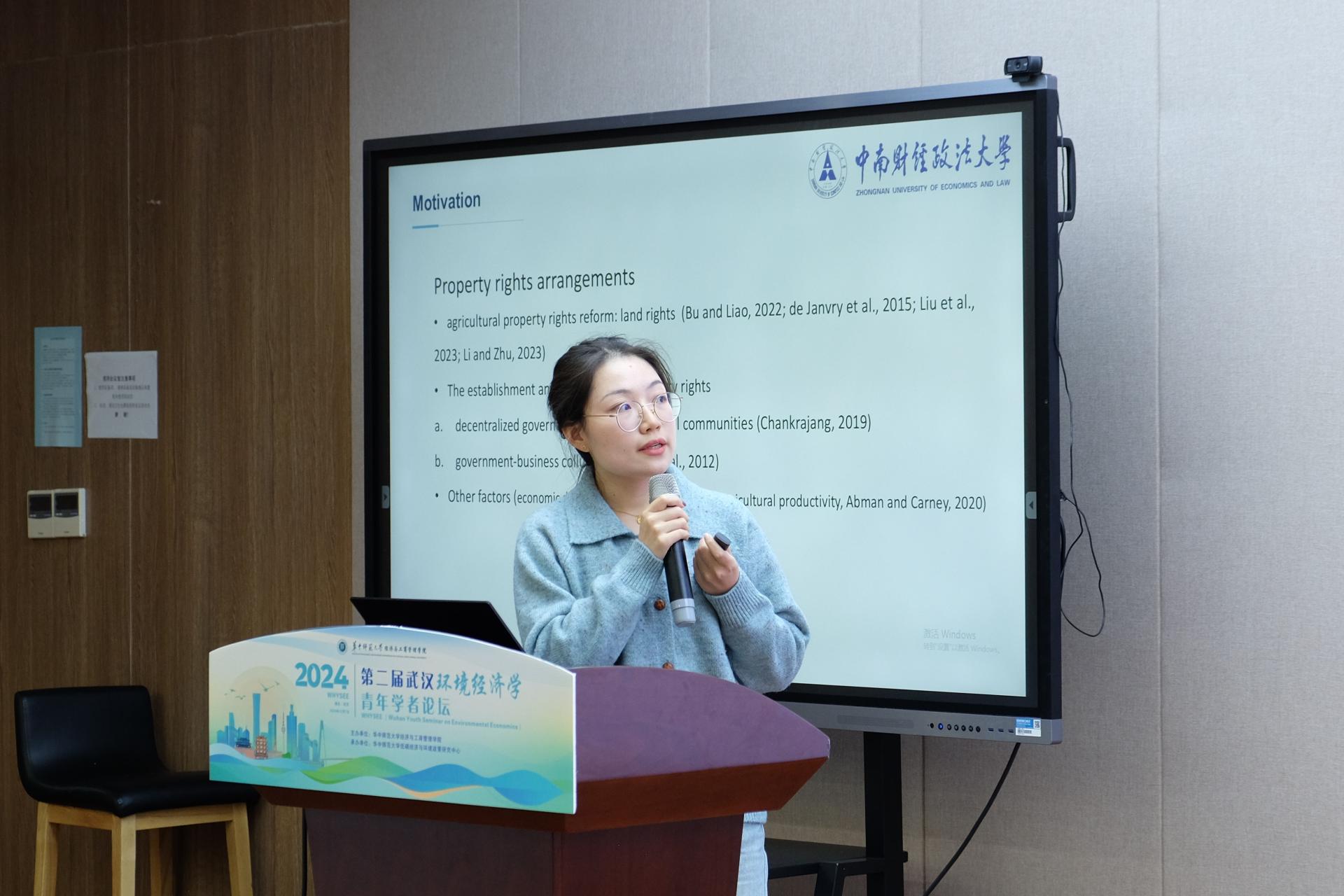 专题研讨四由华中师范大学经济与工商管理学院讲师吴乃迁主持。华中科技大学经济学院博士研究生陈梁分享了题为《以树扩绿:大数据发展如何驱动企业绿色治理》的文章,为充分发挥大数据的绿色治理效应,构建以企业为主体的现代环境治理体系提供了实践启示。中南财经政法大学财务税务学院博士研究生尹傲雪报告论文《林地产权制度改革的绿色发展效应:来自中国集体林权改革试点的证据》,发现林地产权改革显著增加了县域森林覆盖率,并进一步总结出此项改革的有利影响。中南财经政法大学经济学院讲师张燕、华中师范大学经济与工商管理学院副教授朱俊鹏两位点评专家及现场嘉宾对两篇报告给出了精准的评价和深入的分析,为优化论文结构和逻辑思路提供了建议。