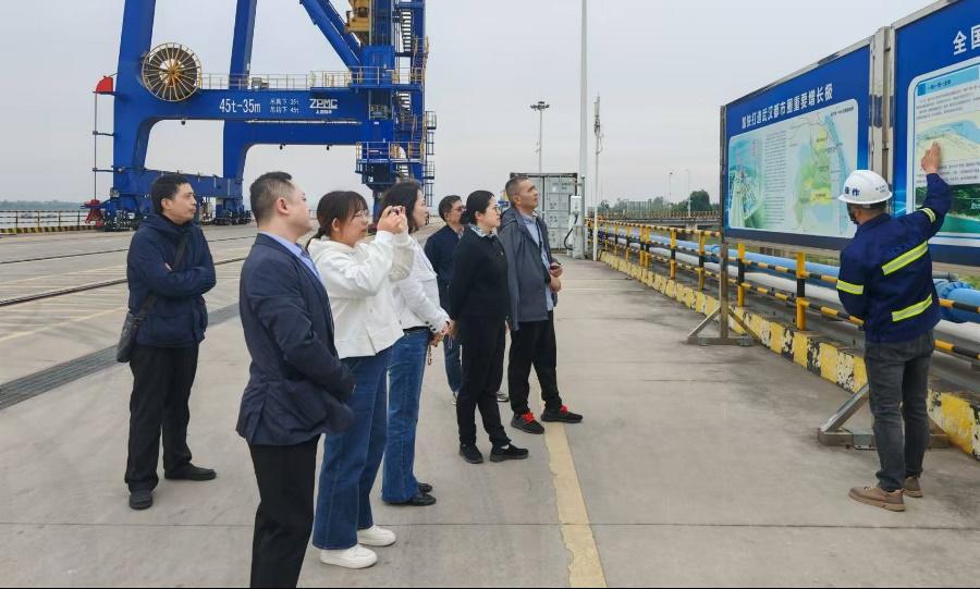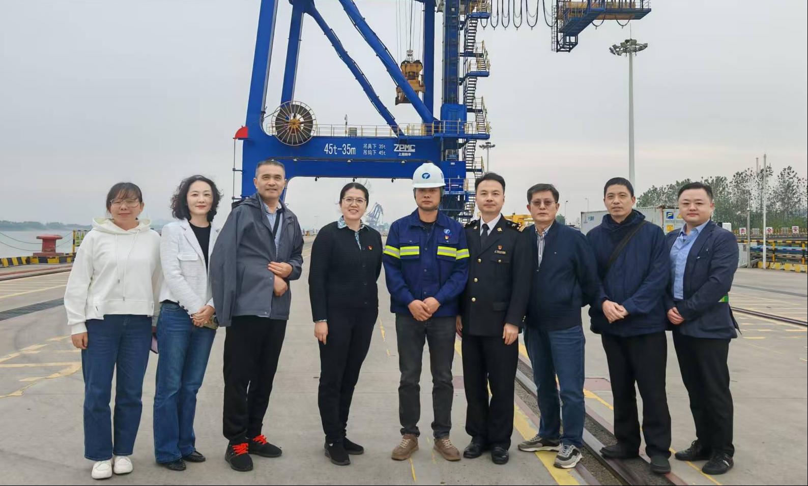 调研第二站是黄石新港。黄石海关工作人员引领教研室老师来到港区,听取了港区负责人对黄石新港的建设发展、产业服务情况、设施与技术、物流功能规划设计等的详细介绍,并现场观摩了港区内的作业流程。