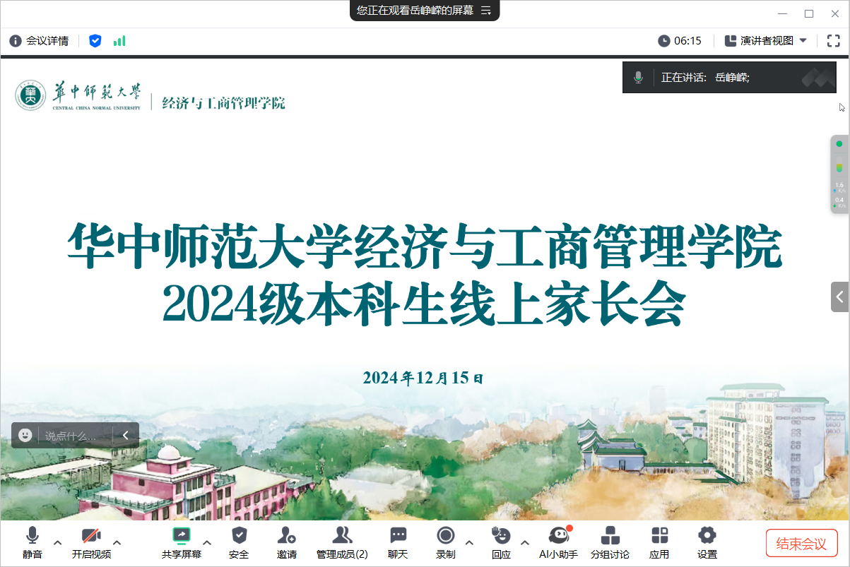“老师,我们家孩子在学校跟同学相处怎么样?”“过往经管学院的毕业生有哪些去向?”为拓宽家校沟通渠道,提升家校协同育人合力,12月15日晚,学院举行了2024级本科生线上家长会,学院党委副书记陈娟、副院长文鹏出席会议,全体2024级本科生家长应邀参会。