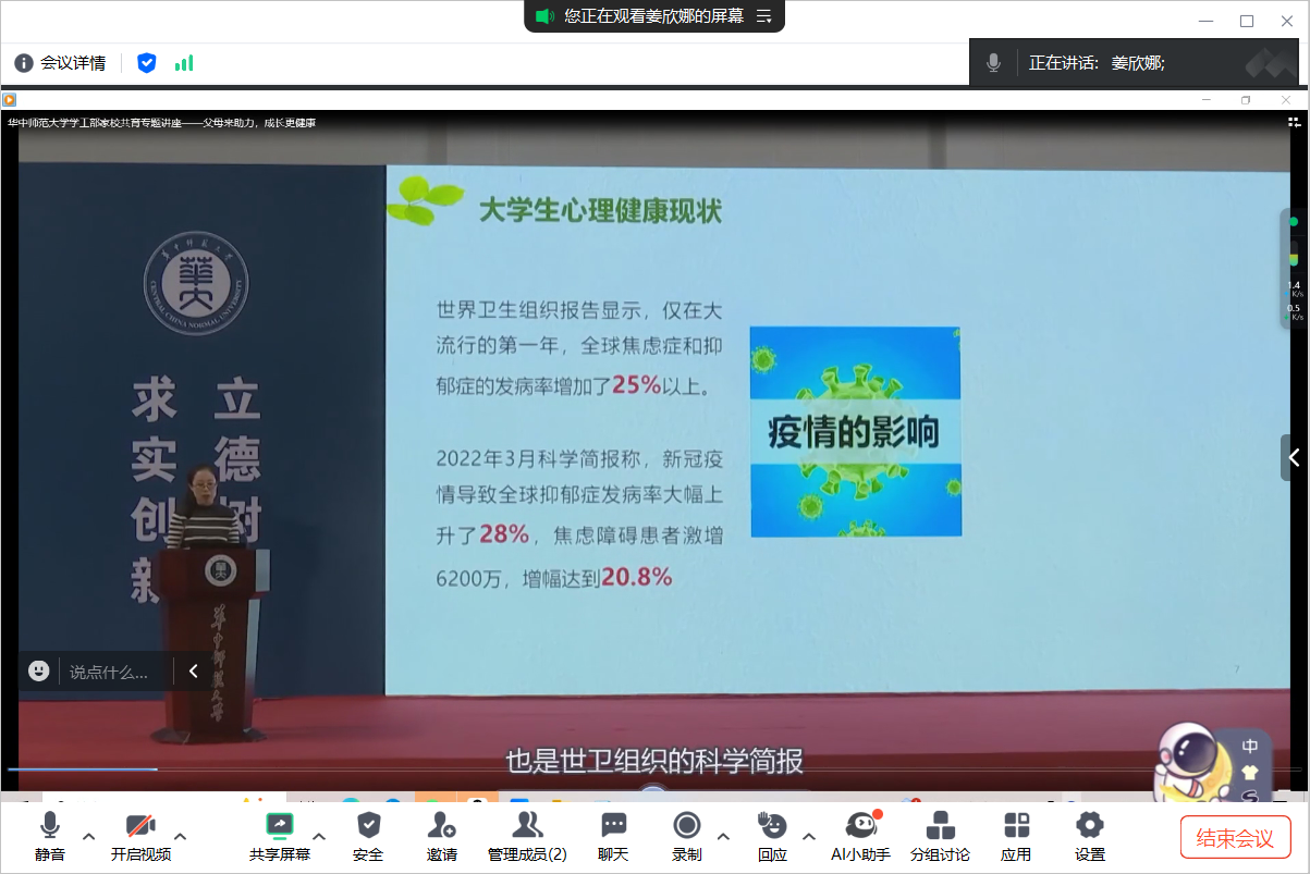 会上,辅导员岳峥嵘介绍了学院2024级本科生的整体情况,通过一系列校园学习生活场景向家长展示学生入学百天来的大学生活。辅导员彭怡婷介绍了关注大学生心理健康问题的重要性,组织与会家长共同观看了由学校大学生心理健康教育中心的于丽霞老师主讲的“父母来助力,成长更健康”专题讲座视频。