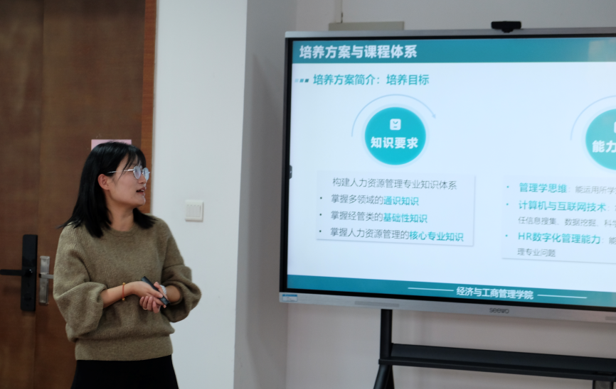 会议伊始,文鹏介绍会议内容,着重指出新的时代背景赋予经管类专业新的发展需求。随后,工商管理系袁潇老师从专业课程体系、专业现状、培养方案等方面详细介绍了我院人力资源管理专业建设情况,提出了课程体系调整、专业建设特色凝练等几个专业发展中遇到的问题和困难。