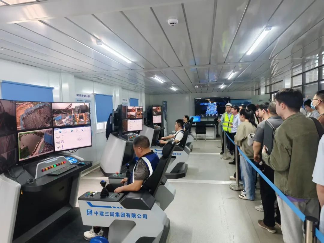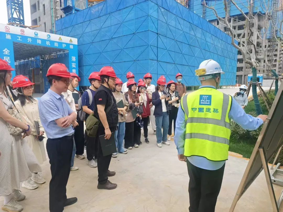 在项目智能施工现场,师生们认真观摩了装配式造楼机的生产工艺和流程。项目应用中建三局自主研发的第二代装配式造楼机,通过平台集成顶加节智能塔机、3D打印机器人、布料机器人、智能无人施工电梯等智能设备,打造“空中智能工厂”,实现关键工序机械化率达85%,工期缩短20%。