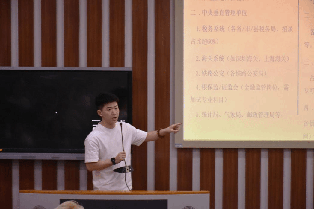 黄聿睦学长从不同的角度分享了考公经验。他首先介绍了几种公务员考试的区别和报录比。结合同学们的需求,他着重分享了选调生的报名要求和近几年报名情况。随后,学长还从多方面讲解了公务员考试的考试题型和自己的备考策略,内容颇丰。