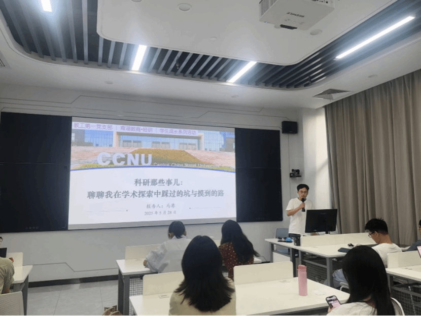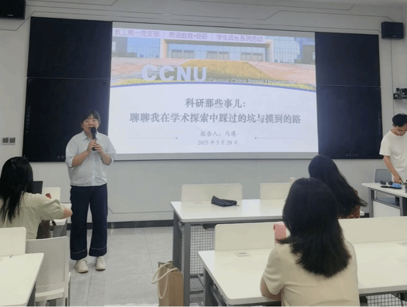 2025年5月28日下午,由华中师范大学经济与工商管理学院教工第一党支部组织的“南湖数商·经研”学生成长系列活动于南湖综合楼N427顺利开展。本次活动邀请了我院2022级经济统计学博士研究生马港,作题为《科研那些事儿:聊聊我在学术探索中踩过的坑与摸到的路》的报告,分享其在学术研究过程中的心路历程与实践经验。活动吸引了众多研究生及部分本科生参与,现场气氛积极热烈。