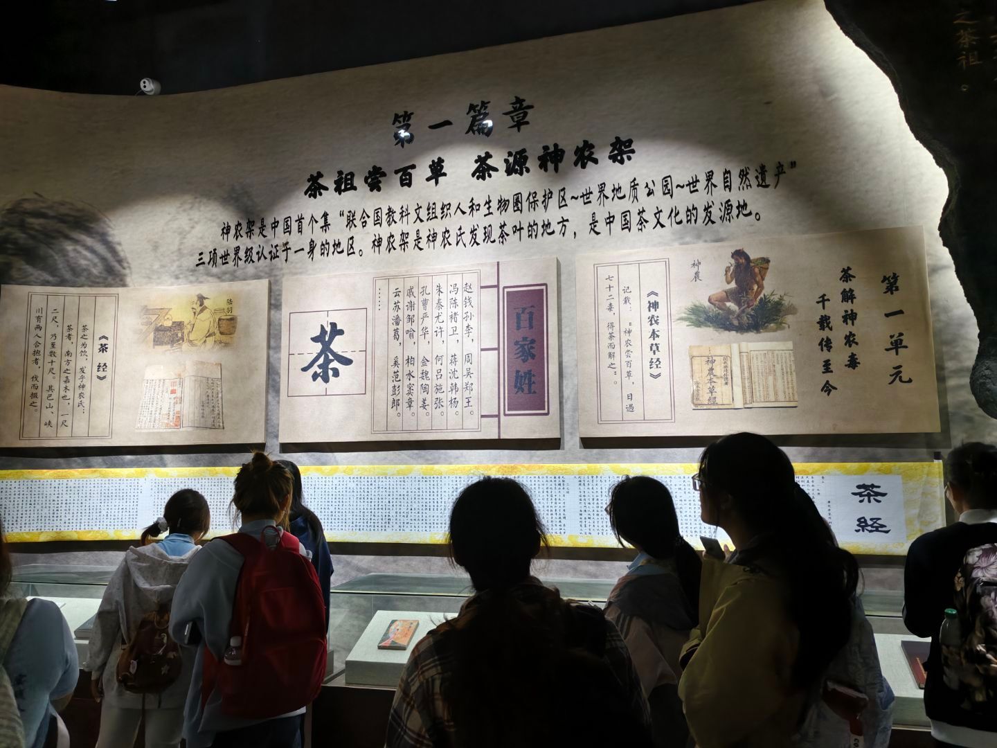 当日上午,实践队一行抵达神农架茶祖博物馆。在讲解员的带领下,队员们开启了茶文化探索之旅。在参观过程中,讲解员介绍了茶叶的多样功效,同时结合馆内展示的制茶工具,深入浅出地讲解了摊晾、杀青、揉捻等传统制作工艺,让队员们对神农架“茶祖文化”的深厚底蕴有了更直观、全面的认识。