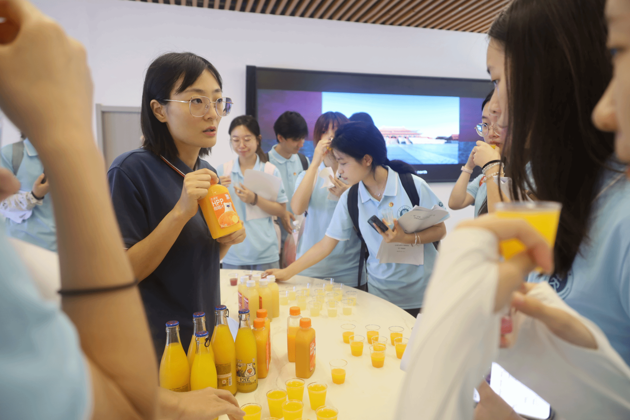 上午九点,实践队队员跟随北京一轻食品(丹江口)工业园的工作人员参观车间生产线。透过密封玻璃,队员们观看到柑橘鲜果在全自动生产线上完成清洗、压榨、灭菌等一系列流程后,被注入铝瓶密封打包。在工作人员的介绍下,队员们了解到依托丹江口水库的优质水源与蜜橘资源,企业携手丹江口市开展柑橘深加工项目,实现资源转化。随后队员们品尝了新研发的产品,更加深刻地体会到保护水源的重要性和优质生态资源的市场价值。
