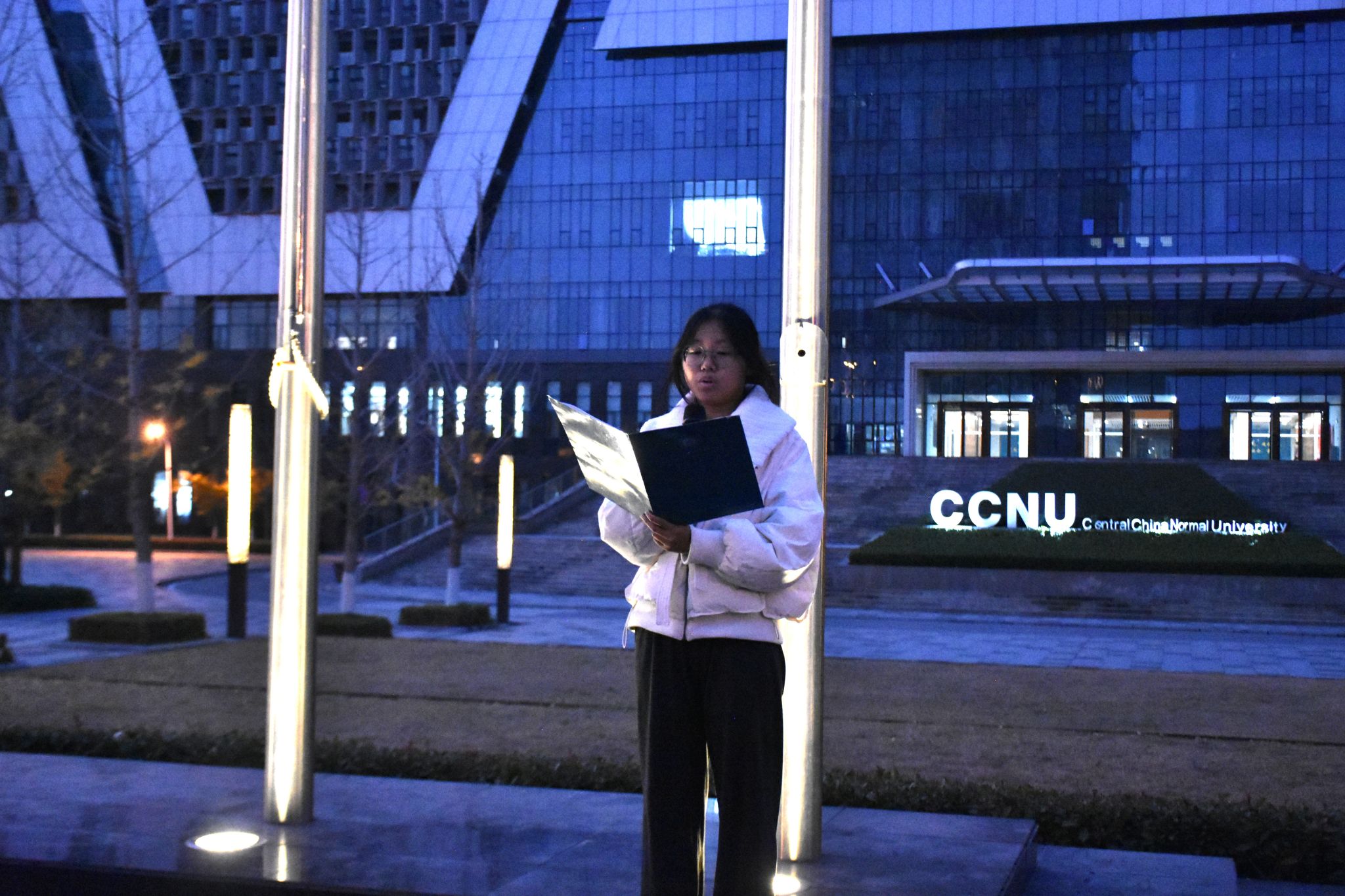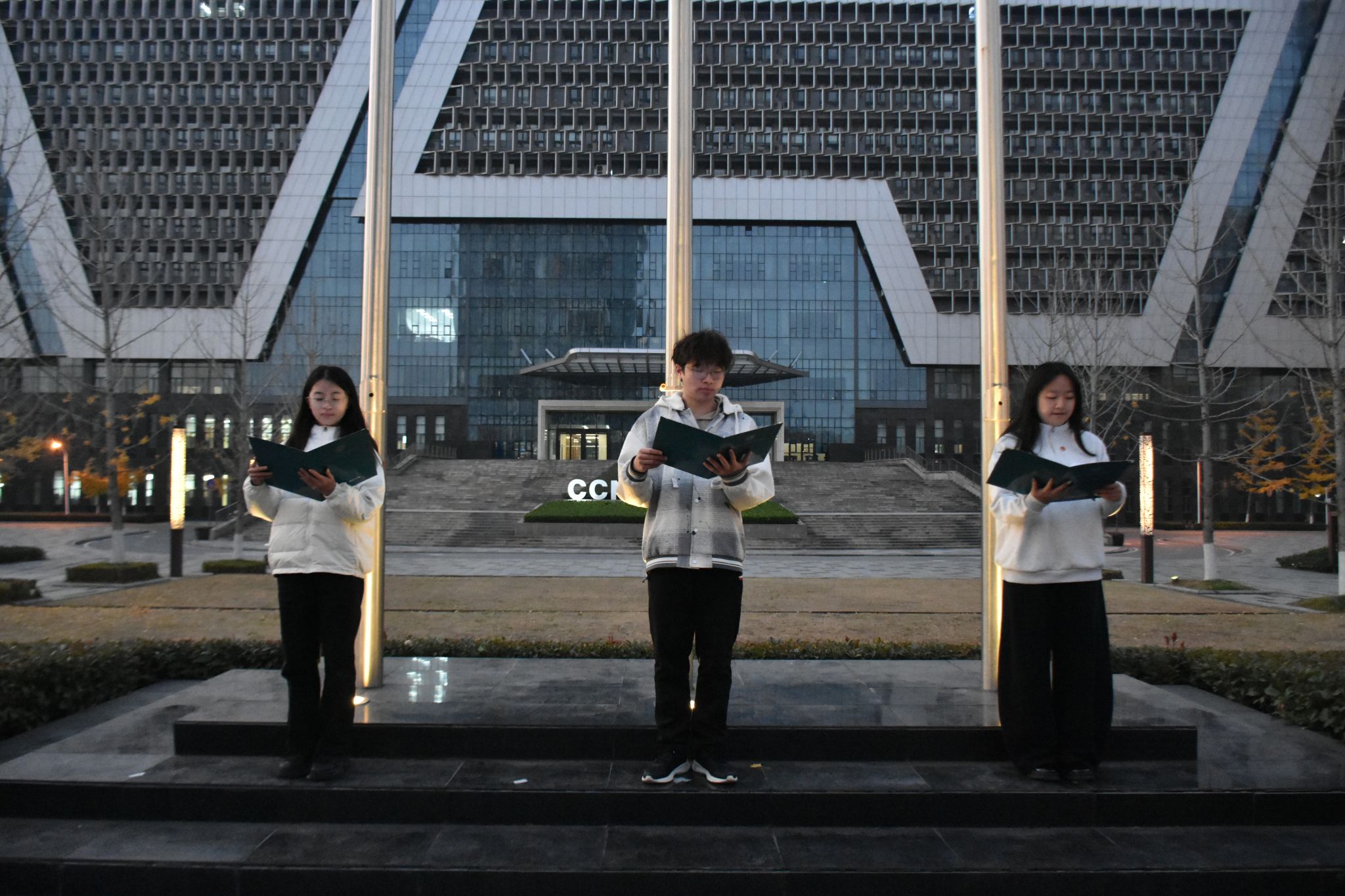 升旗礼毕,我院学生刘依诺、周自豪、陈姝言进行诗歌朗诵《同在法治中国蓝天下》。他们用昂扬的声音歌颂法治力量,呼吁我们在法治中国的蓝天下,向着新目标砥砺前行。
