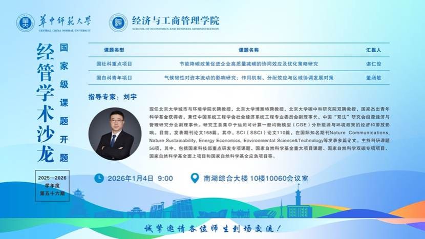 2026年1月4日,北京大学刘宇教授应邀做客第五十六期经管学术沙龙,围绕基金申请与课题撰写开展专题分享。学院书记张勇、院长涂正革、副院长陈淑云、谌仁俊及院内多名青年教师、研究生参加活动。
