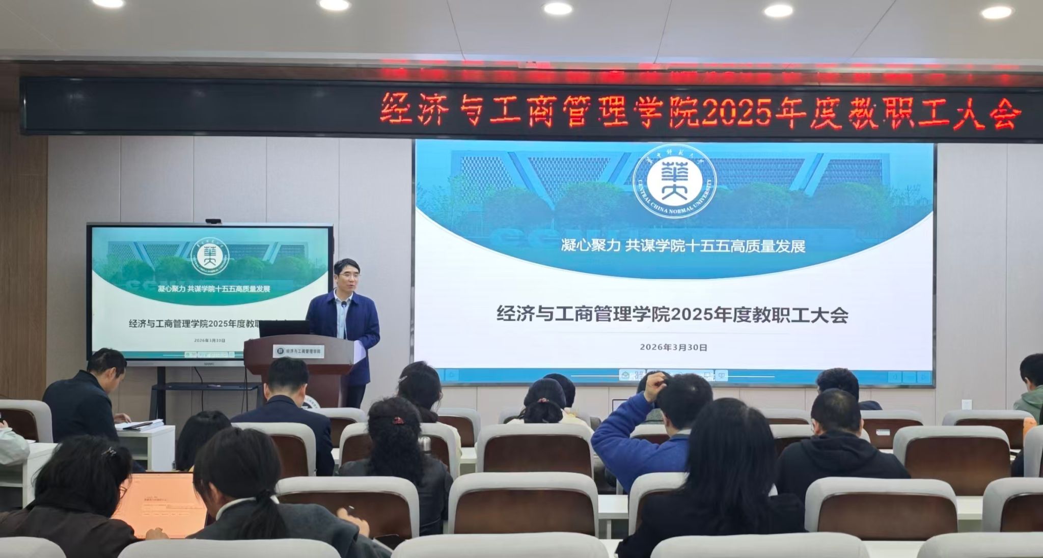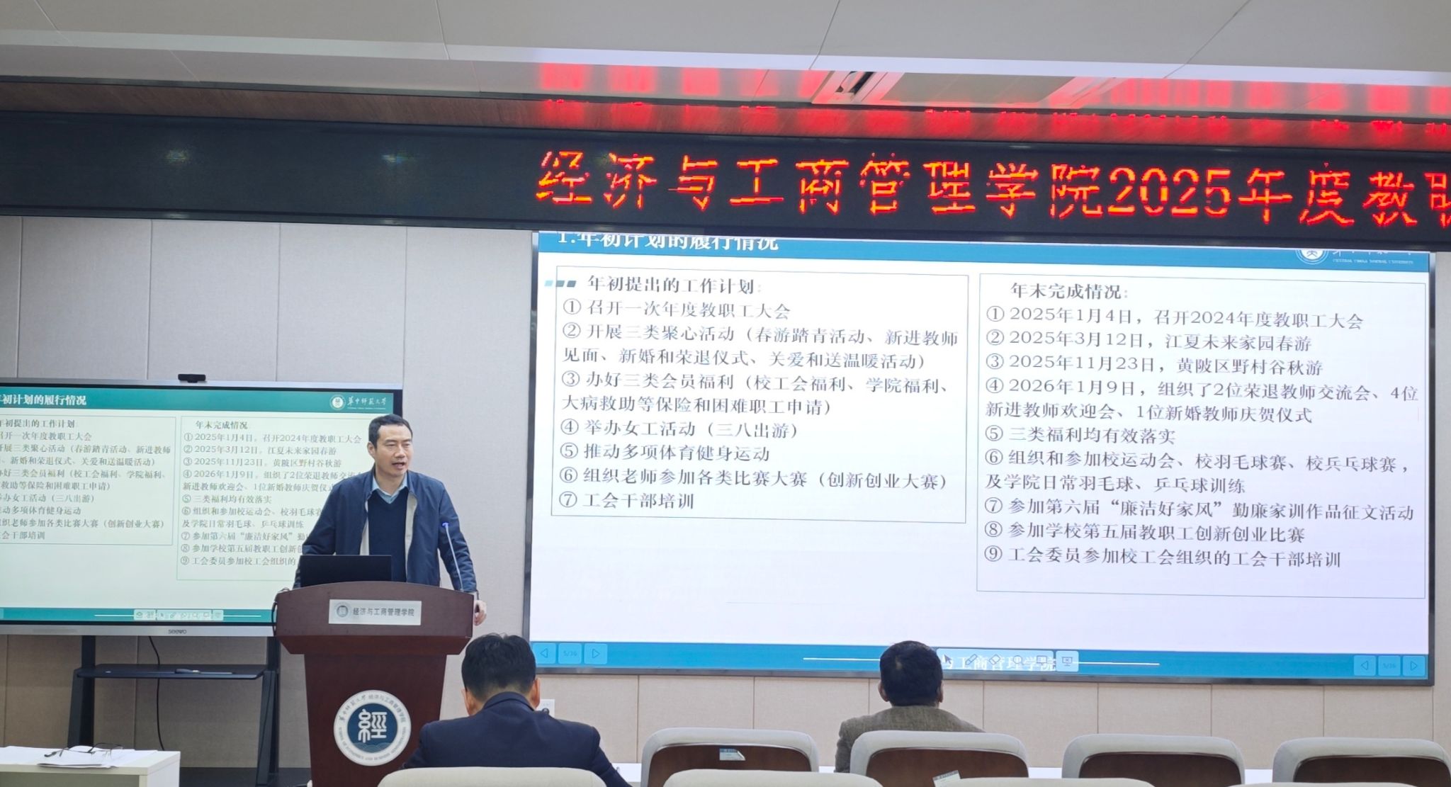 活力三月,春意盎然。3月30日,经济与工商管理学院在南湖综合楼10127报告厅召开2025年度教职工大会。大会由学院正处级组织员徐杰主持,全院教职工齐聚一堂,共同回顾总结过去一年的工作,擘画未来发展蓝图。